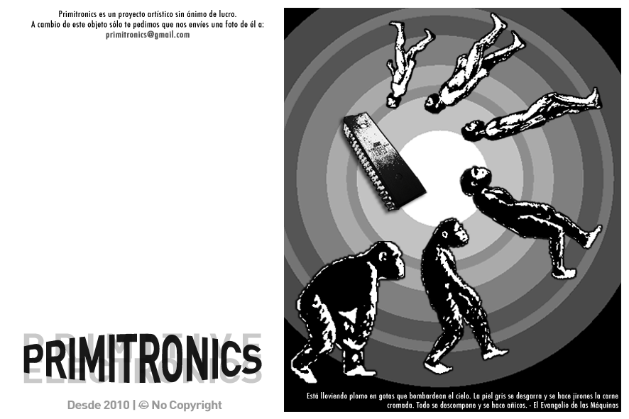 Primitronics es, evidentemente, una contracción de las palabras Primitive y Electronics y busca conjugar ambos conceptos en una serie de actividades relacionadas con la artesanía. La idea básica era recrear la relación que una tribu primitiva podía haber tenido con la tecnología actual y como la podía haber incorporado a su fabricación cultural. Por ello, utilizando componentes electrónicos obsoletos, me dediqué a desarrollar técnicas de elaboración de bisutería.
